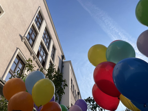 Bevor es für die Erstklässler mit ihrer neuen Lehrerin in das Schulhaus ging, wurden mit guten Wünschen gefüllte Ballons in den Himmel geschickt.